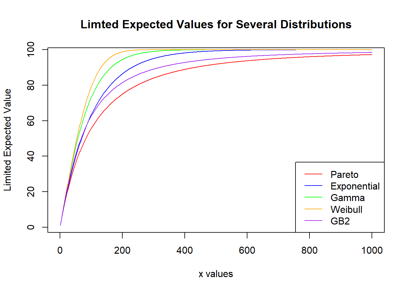 \[ \begin{matrix} \begin{array}{l|c|c} \hline \text{Distribution} & \text{Parameters} & \mathrm{E}[x] & E[X\wedge100] & E[X\wedge250] & E[X\wedge500] &E[X\wedge1000] \\ \hline \text{Pareto} & \alpha = 3, \theta = 200 & 100 & 55.55 &80.25 & 91.84 & 97.22 \\ \hline \text{Exponential} & \theta = 100 & 100 & 63.21 & 91.79 & 99.33 & 99.99 \\ \hline \text{Gamma} & \alpha = 2, \theta = 50 & 100 & 72.93 & 97.64 & 99.97 & 100 \\ \hline \text{Weibull} & \tau=2, \theta=\frac{200}{\sqrt[]{\pi}} & 100 & 78.99 & 99.82 & 100 & 100 \\ \hline \text{GB2} & \alpha = 3,\tau=2,\theta = 100 & 100 & 62.50 & 86.00 & 94.91 & 98.42 \\ \hline \end{array} \end{matrix} \]